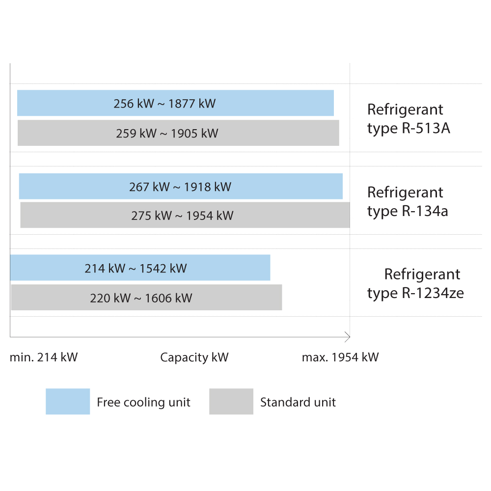 Ces systèmes n’occupent pas plus de place qu’un groupe d’eau glacée standard sans fonction refroidissement naturel.
