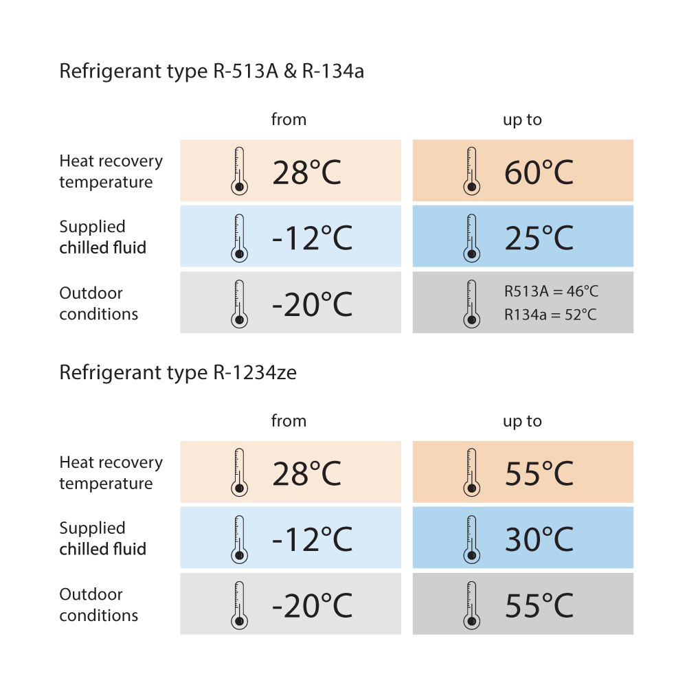 Ceci permet de récupérer une partie ou la totalité de la chaleur générée pendant le processus de refroidissement. L’efficacité énergétique est ainsi améliorée et les coûts d'exploitation sont réduits. Avec la récupération totale de chaleur, l’unité dispose d’un condenseur supplémentaire par circuit pour la production de l’eau chaude. Avec la récupération partielle d’énergie, l’unité dispose d'un désurchauffeur par circuit pour la production de l'eau chaude. Ce système de récupération de chaleur permet de produire de l’eau chaude pouvant être utilisée pour satisfaire les besoins d'applications spécifiques.