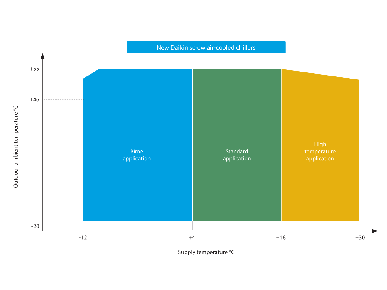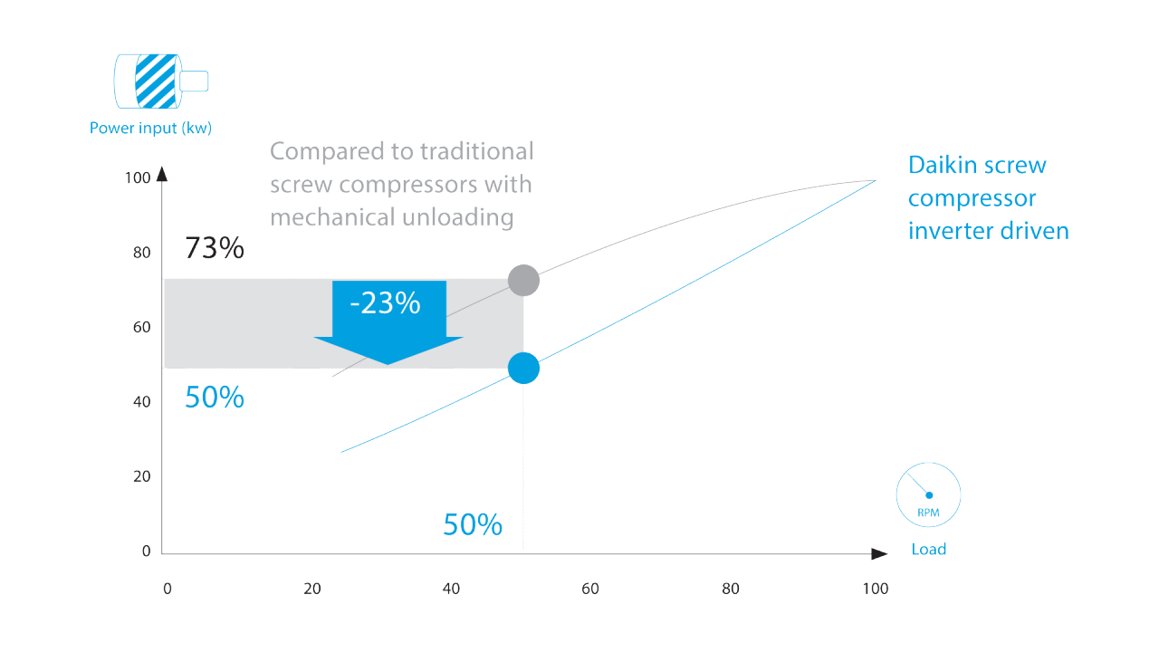La technologie Daikin VFD permet à l’unité de fonctionner de façon optimale, avec une réduction et une maîtrise des coûts d’exploitation dans toutes les conditions de fonctionnement. Le compresseur monovis maison intègre la technologie VVR qui module le taux de compression et améliore ainsi l’efficacité du compresseur dans des conditions extérieures variables.