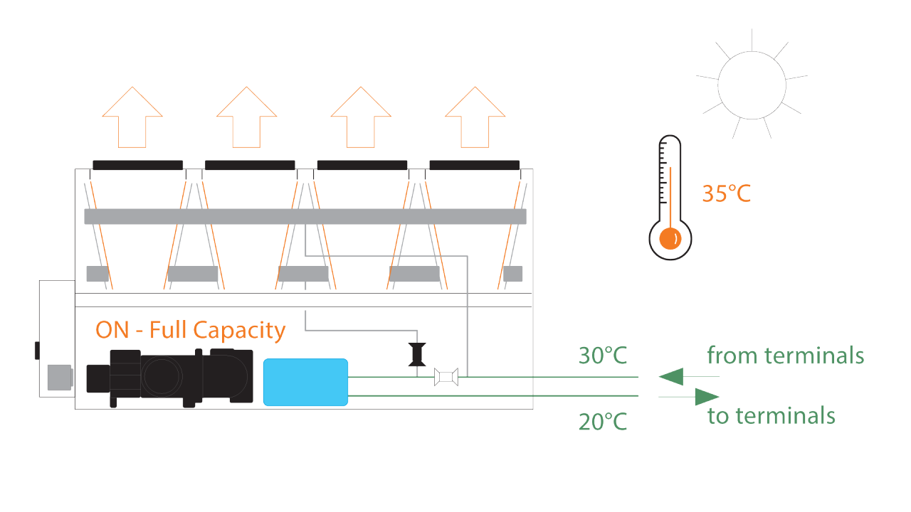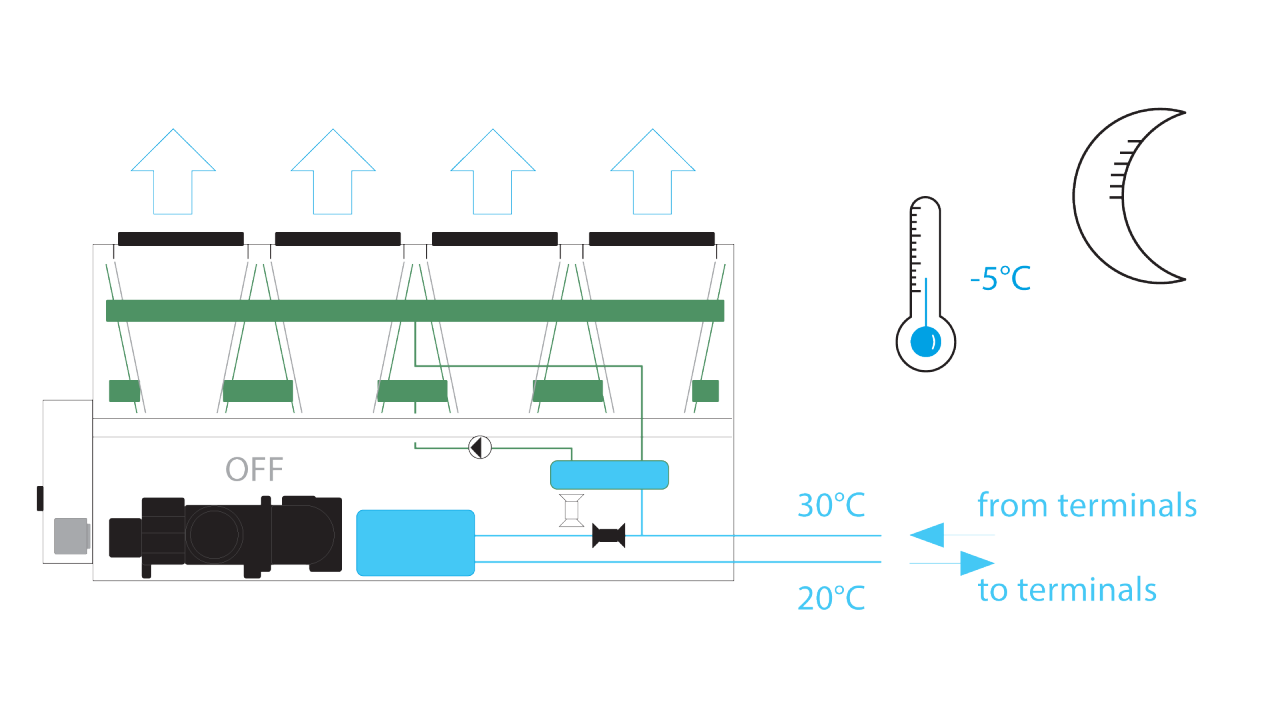 Le système à refroidissement naturel est conçu pour refroidir le liquide à l’aide de l’énergie frigorifique issue de l’environnement. Lorsque la température extérieure est supérieure à la température du liquide, l’unité génère la puissance frigorifique avec les compresseurs seulement (mode refroidissement mécanique). Lorsque la température extérieure chute en dessous de la température du liquide entrant dans l’unité, l’air extérieur peut être utilisé pour refroidir le liquide avant qu’il n’atteigne l’évaporateur, avec commutation du refroidissement naturel partiel au refroidissement naturel total en fonction de la variation de température extérieure.