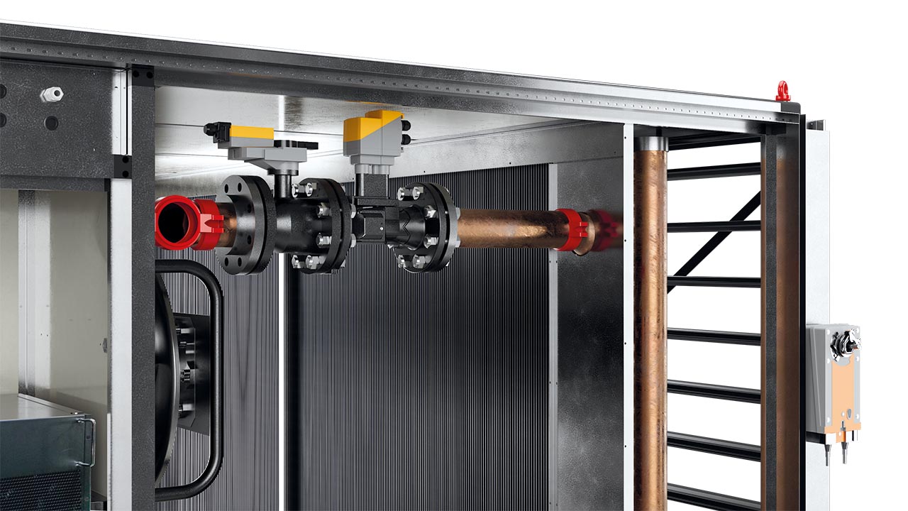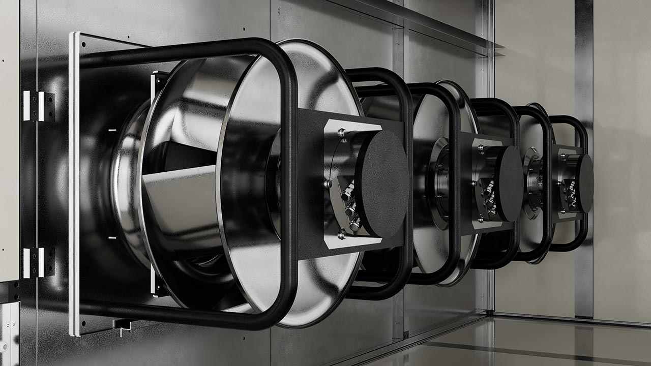 Les filtres à air, le panneau de commande, l'onduleur, le réseau de ventilateurs, la batterie de refroidissement (jusqu'à 8 rangées) et les registres sont intégrés en fonction de vos besoins dans une enceinte en profilé d’aluminium anodisé posée sur un châssis en acier galvanisé à chaud. L’ensemble du module est pré‑testé et prêt à l’emploi.